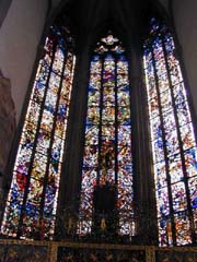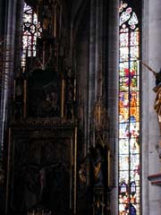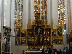 St.Jakob教会へ行く。1.5EURO払って前の方まで入る。1311-1490年建築のゴシック教会だが、1544年にプロテスタント化。・・・思いっきり偶像がある気が。ステンドグラムもど派手だし。祭壇には十字架のキリスト像まである。祭壇の右には預言者の像、左には三位一体を表す彫刻。ここでデジカメの電池が切れた。