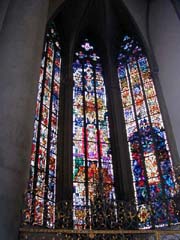 でも大聖堂の中はどうしても見たいので、大聖堂の裏手(北側)をぶらついて時間をつぶす。Hofgartenをのぞくと優雅に読書している女性がいて、ともぶが珍しがっていた。さらに歩いて、市立劇場とその隣に隣接する教会をのぞく。ステンドグラスあったー(そればっかり)。