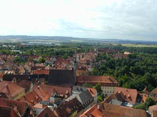 来た道を戻って、ちょうど10時なのでRathausの塔に登る(1EURO)。階段は急で最後は梯子になり、上階は立つ場所もないほど狭く、強風で吹き飛ばされそうだった。でも眺めは最高。Rotenburgの町並みがぐるっと見渡せる。西と南は森だが、東には城壁の外にも現代的な町が続いていた。ねばって360度写真を撮る。北はSt.Jacob教会で北端のKlingen稜堡は死角になっている。