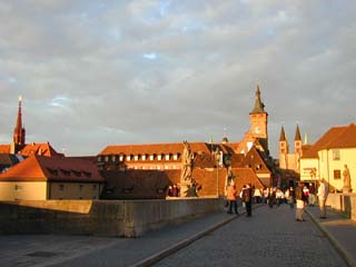 7時半、教会めぐりは終わって、次はレストラン探しだ。なかなかいい店が見つからず、Alte Main橋(1473-1543)に出てしまった。Main川を渡る石橋で、両側に石像が並んでいる。そこからのMarienberg要塞の眺めが素晴らしい。この町で重要なSt.Kilianの像と一緒に。