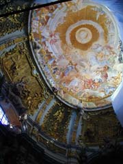 教会内部の半分は工事中で幕に覆われていた。アザムさん作は、絢爛豪華なロココ様式というけれど、世界遺産のヴィース教会のような優美さはなく、ゴテゴテして下品だ。よく見ると天空の雲から子供たちの足とか首がにょきにょき出ていたり、グロテスクで悪趣味……。ひょっとしてこの雲は内蔵のイメージ?