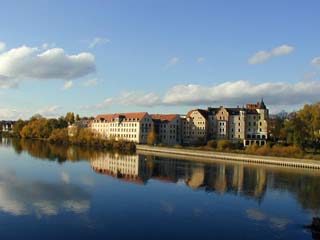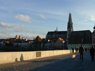 ぜっとんがお腹がすいて無口になっているので、出て橋の方へ歩く。店の選択はぜっとんにお任せ。レーゲンスブルグに来たら地元のソーセージ、レーゲンスブルガーを食べねば!ということで、橋のたもとの店Historische Wurstkuecheでドナウ川を眺めながらアップルジュースで食す。ドナウ川うつくしかーっ。