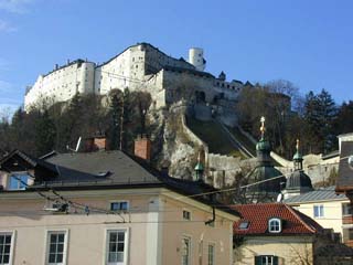 ホーエンザルツブルグ Hohensalzburg 城塞 (1077-17c) へは歩いても上がれるが、ケーブルカーに乗ってあがる(8.9EURO)。早くてあっという間。城は入り組んでいて、中世の城ーっ、城塞ーっ、で感じ。