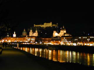 車をとって道に迷ってようやく橋を渡れたが、もう真っ暗なので諦めた。その代わり、振り返ると Hohensalzburg 城などの町並みがライトアップされていて、夜景がすごく綺麗だったー。