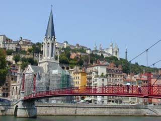 もう川沿いにきているので、また丘の上の白き Fourviere大聖堂 を眺めつつ、ソーヌ川に沿って北上。St. George 教会、その前の赤い橋とのコンビネーションがいい。でも灰色の尖塔の下は工事中。