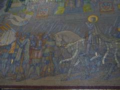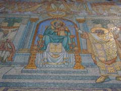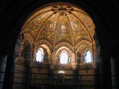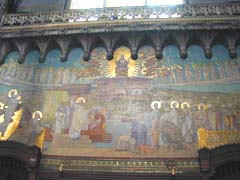 右側廊の階段から大理石の踊り場をすぎて地下室におりる。天井が低く、ロマネスク風だが、柱が違って飾りまくり。天井が黄色いのはちょっと。祭壇の天井のモザイクもデザインがいまいち。