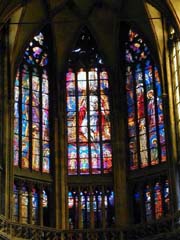 祭壇の右手、赤いカーテンの下にどーんと銀色の、聖人の彫刻(写真左から1番目)。目玉っぽいWenceslas礼拝堂?(2番目)もまあまあ。フレスコ画で埋めつくされているようだが。いかんせん中に入れてくれないからわからん。有名なミュシャのステンドグラス(5番目)は絵画的でたしかによかった。