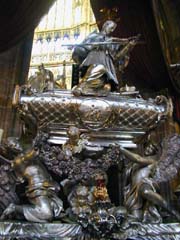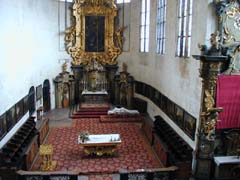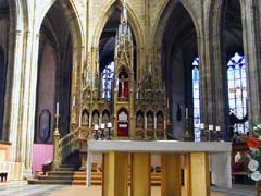 内部、祭壇(写真右端)はちょっと手前にあって、奥にもぐるっと礼拝堂が続く。マリア像、三博士、受胎告知など、各祭壇の彫刻はなかなかよかったが、絵画やフレスコ画はいまいちで、ステンドグラスは新しかった。地下クリプトにはボヘミア王家の墓がある。