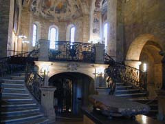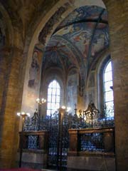 こういう、ロマネスクの教会にたまにある、後陣が二階建なのはなんだろう。手前の祭壇(や天蓋)の左右から階段がかかり、二階にまた祭壇があるという。この形式が私は最も美しいと思う。天井画の傷みが激しいのが残念。右奥の礼拝堂の天井フレスコは綺麗そうで目玉っぽいが、入れない。