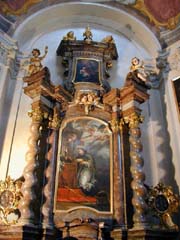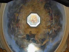 入口付近の礼拝堂の装飾はめっちゃバロック。祭壇画にうねうね柱もかかってるし。ここにきてまともな天井画をようやくみた。