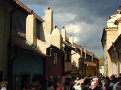 Golden Laneとかいう一角。黄金?? カラフルな二階建ての古い小さな家が立ち並ぶ。カフカの泊まった水色の家とか。でも、東京のラッシュアワー並の混雑で身動きがとれず、なにがなにやら。