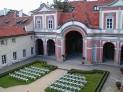 ロマネスクの Klaster sv. Jiri 聖イジー教会 (920創建, 12c再建)、ファザードは思いっきりバロック(17c)。二本の尖塔が白いのがヘン。再建なんだろうなあ。