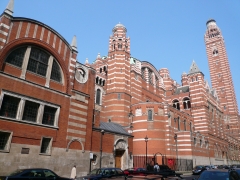 ウェストミンスター大聖堂 Westminster Cathedral (1895-1903, ビザンチン様式, 83m)。寺院とは関係ないらしい。ローマカトリックの大本山。おー、赤と白の煉瓦作りの建物がかっちょえー。