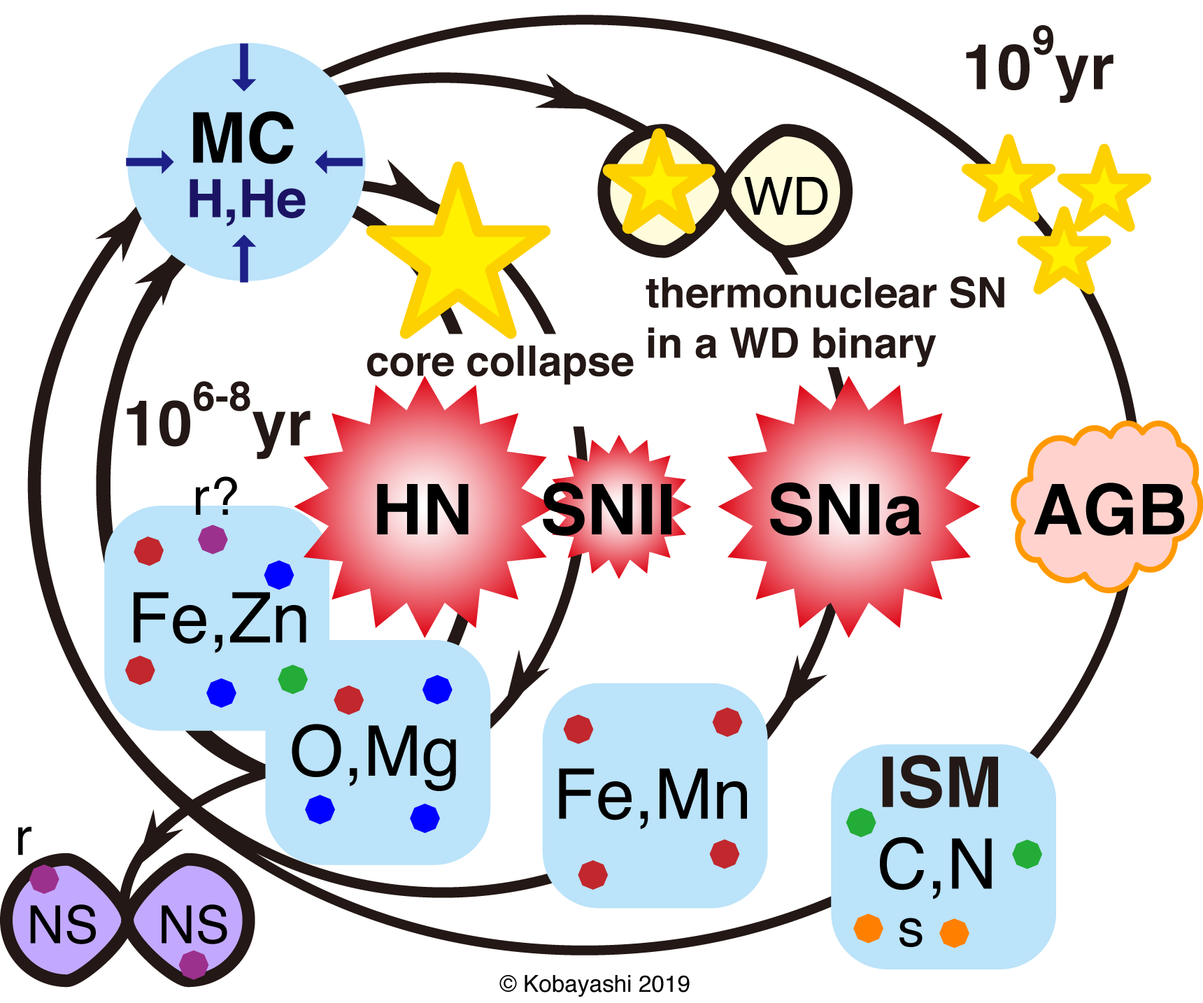 - Supernova nucleosynthesis yields updated, and hypernovae are important for zinc (Zn) abundances (Kobayashi, Umeda, Tominaga, et al. 2006).