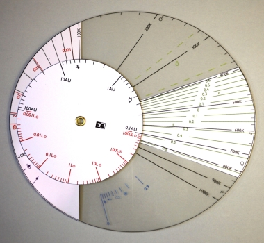 Keeping both your settings fixed, you must now decide how far your planet is from the star. This distance is measured in a unit called the Astronomical Unit (AU). 1 AU is the mean distance of the Earth from the Sun. The temperature on the elliptical dial opposite the distance you have chosen for your planet is the surface temperature of the planet.
